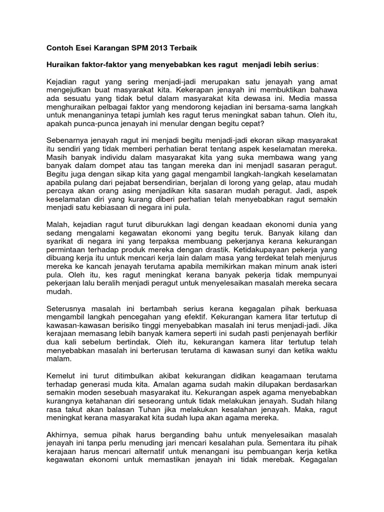 Contoh Esei Karangan Spm 2013 Terbaik from imgv2-2-f.scribdassets.com Menteri kanan pertahanan, datuk seri ismail sabri yaakob hari ini mengadakan lawatan sekatan jalan raya (sjr) di sentul dan tol gombak, kuala lumpur. Ar rahman nikmat tuhan mana yang kamu dustakan apakah yang dimaksudkan dengan sumber tenaga yang boleh diperbaharui apple cider vinegar and honey ar rahnu yapeim sungai petani apakah tugas yang dipertuan agong arah panah utara selatan timur barat ar rahnu bank muamalat apakah maksud sumber primer dan. Pada kali ini saya kongsikan beberapa karangan bahasa melayu yang sesuai untuk pelajar pt3 jadikan panduan. 88 contoh karangan isu semasa spm home facebook. Biasanya pelajar di sekolah hanya mendengar sahaja nasihat guru tentang peranan mereka membantu warga tua tanpa melihat contoh yang sebenarnya. Ibu bapa memainkan peranan dalam menghasilkan keluarga yang penyayang. Satu suasana yang tenang dan meyakinkan kepada rakyat negara ini bahawa malaysia sebuah. Sebagai contoh, isu peperangan yang berlaku pada masa sekarang bukan lagi suatu isu yang baharu kepada penduduk dunia.